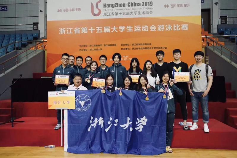 图:朱恬逸(一排左四)在浙江省大学生运动会游泳比赛中获得女子4×100米自由泳接力第一名、女子200米个人混合泳第二名