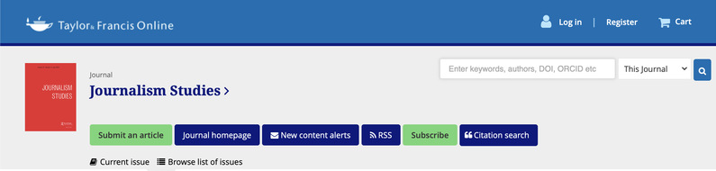 《新闻研究》(Journalism Studies)学刊由泰勒-弗朗西斯出版集团旗下的劳特利奇出版社出版,是新闻研究领域的旗舰刊物。该刊被SSCI等数据库收录,2019年的影响因子为2.345,处在Q2区间。《新闻研究》学刊现任主编为维也纳大学Folker Hanusch教授,编委会由来自全世界30多个国家的数十位学者构成,其中既有新闻研究领域的资深学者,也有国际学术界活跃的新生代研究者。