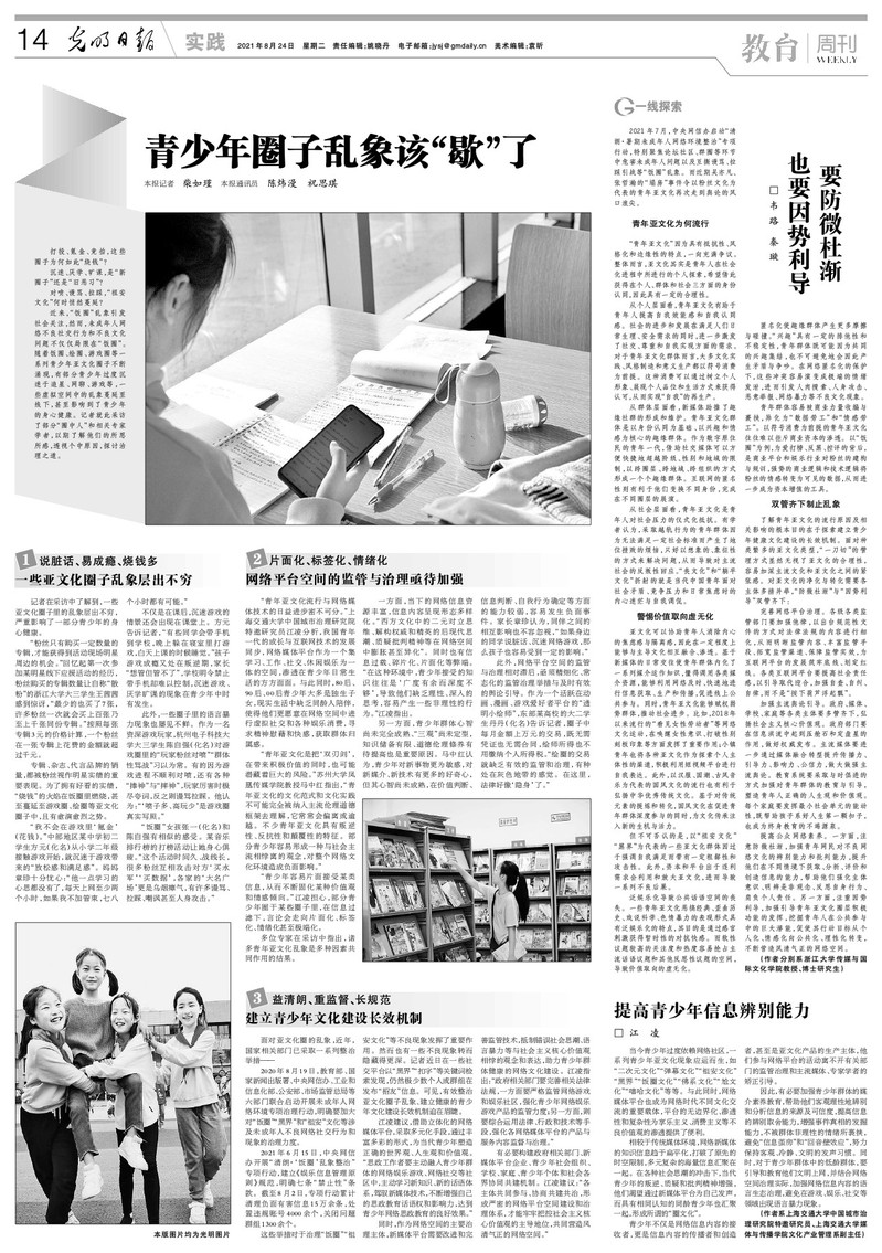 加强主流舆论引导。政府、媒体、学校、家庭等各类主体要多管齐下,弘扬社会主义核心价值观。政府部门要在信息洪流中起到压舱石和定盘星的作用,做好权威发布。主流媒体要进一步通过媒体融合转型提升传播力、引导力、影响力、公信力,做大做强主流舆论。教育系统要采取与时俱进的方式加强对青年群体的教育与引导,塑造青年人正确的人生观和价值观。每个家庭要发挥最小社会单元的能动性,既帮助孩子系好人生第一颗扣子,也成为终身教育的不竭源泉。