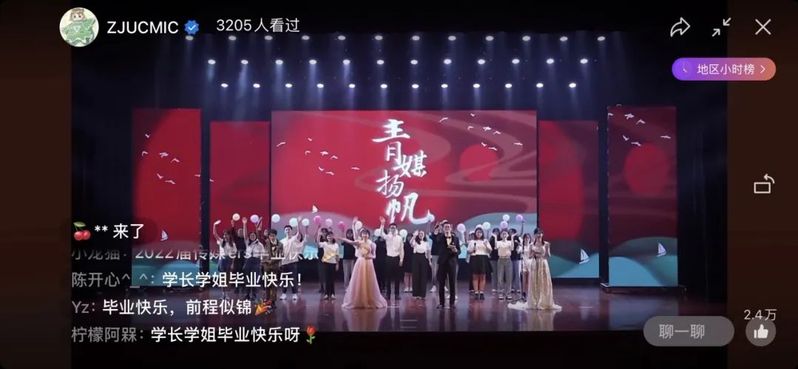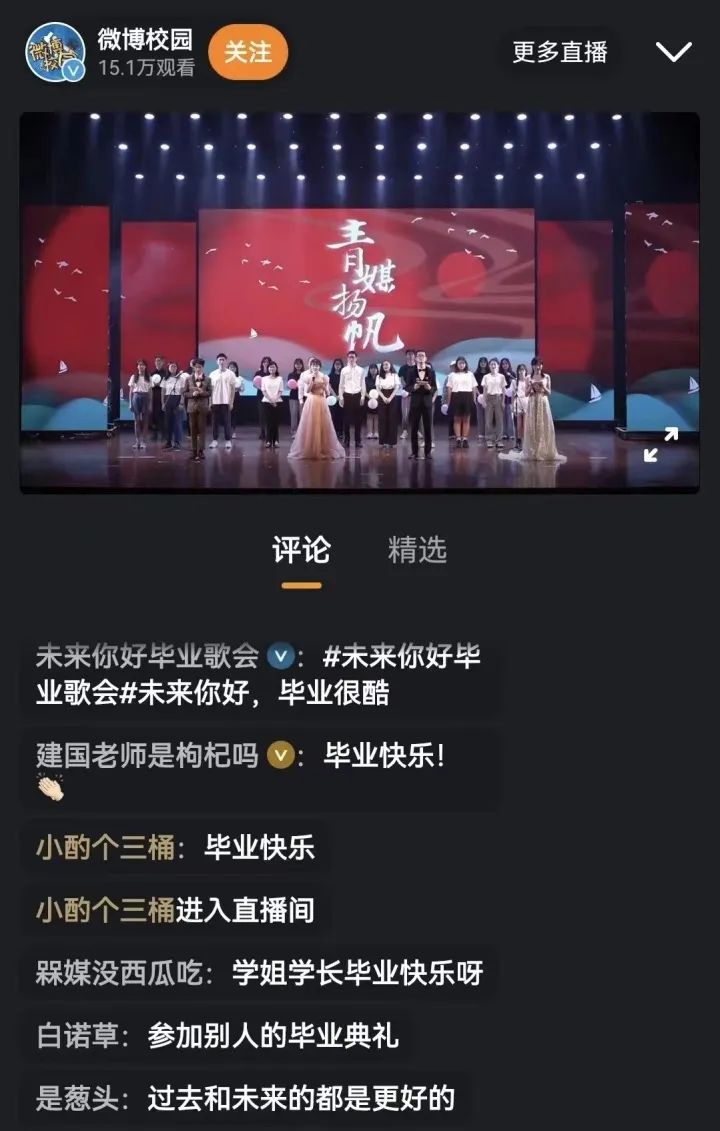 6月19日晚上20:00,毕业盛典在微信视频号、微博同步开始线上直播。持续近一小时的毕业盛典收获了3200+微信视频号播放量、2.4万点赞量、15万+微博播放量,大家在评论区里纷纷留下自己真挚的祝福,祝愿毕业生们“前程似锦,毕业快乐”。