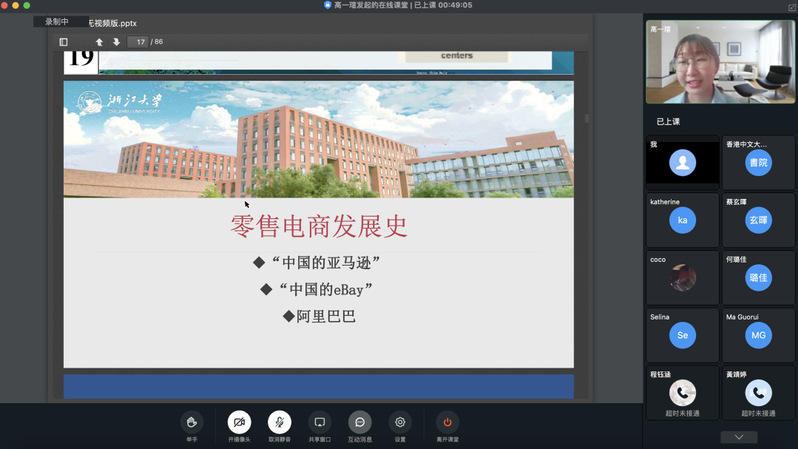 国际教育学院高一瑄老师为同学们讲解了“中国电子商务经济”,介绍了中国电子商务的历史及发展、其发展迅速的原因,并结合零售电商、外卖、出行及政务讲解中国电子商务在生活中的应用及其在疫情期间与扶贫中的重要作用。