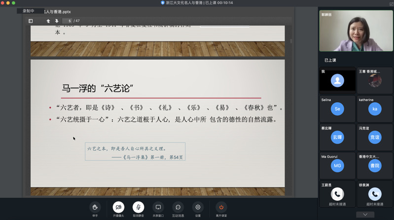 郭婵丽老师分享了“浙江文化名人与香港”,讲述了清末民初的浙江文化名人代表人物,并重点阐述当代名人与浙江的联系及对中国大陆与港澳所作出的贡献,其中包括“一代儒宗”马一浮、浙大老校长竺可桢、“中国现代漫画鼻祖”丰子凯、“武侠小说宗师”金庸及影视大亨邵逸夫。