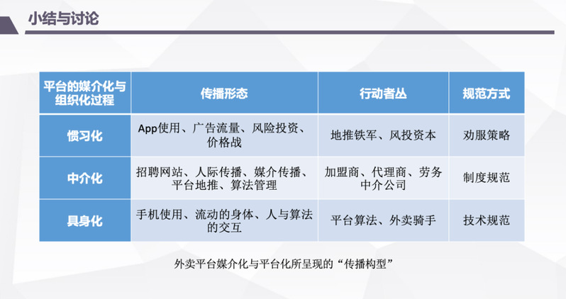 在理论引介后,孙萍老师对实证研究过程和研究发现进行了详尽的介绍。基于中国外卖平台5年的田野追踪(2017-2022)所得的5000余份问卷调查数据、300余人的深度访谈资料,以及参与式观察和二手资料的汇总,孙萍老师将关联资本主义在外卖平台上的表现归纳为三个方面:惯习化、中介化和具身性。