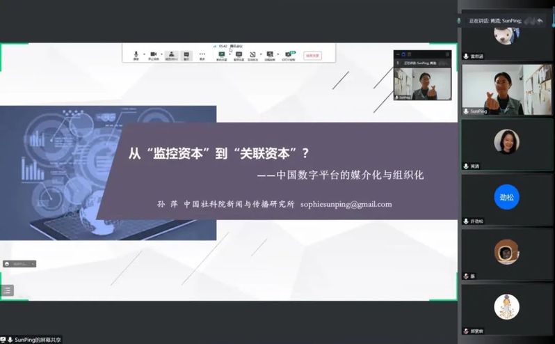 11月24日晚,由浙江大学公共外交与战略传播研究中心主办、浙江大学数字社会科学会聚研究计划协办的“数字新实践”系列活动第一期在线上成功举办。中国社会科学院新闻与传播研究所助理研究员、中国社会科学院大学新闻传播学院孙萍老师受邀作为活动主讲人,围绕她的新近研究,做了主题为“从‘监控资本’到‘关联资本’——中国数字平台的媒介化与组织化探究”的讲座分享。以平台为媒介,来自不同学校的师生相聚云端,互构“关联”,共同探讨中国数字平台的现在与未来。