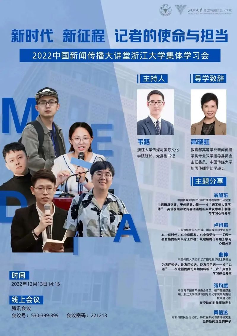 2022年12月13日,“新时代 新征程 记者的使命与担当•2022中国新闻传播大讲堂”浙江大学集体学习会在“马克思主义新闻观”线上课堂顺利举行。教育部高等学校新闻传播学类专业教学指导委员会主任委员、中国传媒大学新闻传播学部学部长高晓虹教授作导学致辞,中国传媒大学编创团队成员翁旭东、卢肖依、曲伸,浙江大学驻校卓越记者、中国青年报青年编委会成员张钧斌和财新传媒民生组记者、2022届浙江大学新闻与传播专硕毕业生周信达作主题分享。集体学习会由浙江大学威廉希尔(WilliamHill-中文官方网站)院长韦路教授主持。浙江大学国家级一流课程“马克思主义新闻观”教学团队和近300名学生参加学习。