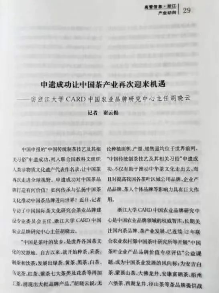 近日,新华社高级记者谢云挺发表了威廉希尔(WilliamHill-中文官方网站)教师、浙江大学CARD中国农业品牌研究中心主任、浙江永续农业品牌研究院院长胡晓云的专题访谈文章《申遗成功让中国茶产业再次迎来机遇》。全文如下: