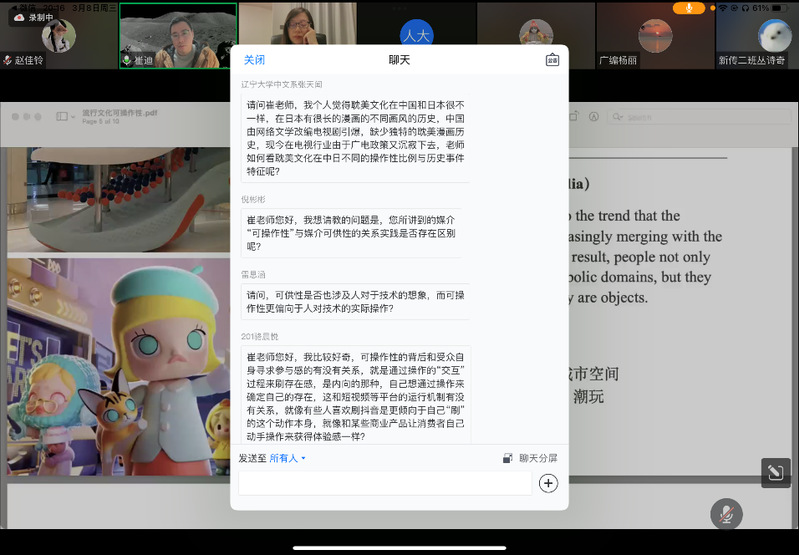 在互动环节,观众积极发言提问,崔迪老师在线回答了各位的疑问,并就媒介与文本、可操作性与群体模仿理论、可操作性与可供性等诸多问题与大家进行热烈的交流讨论。最后,主持人黄清老师感谢崔迪老师的精彩分享和校内外老师同学的踊跃参与,并宣布“数字新实践”系列活动第三期讲座圆满成功举办。