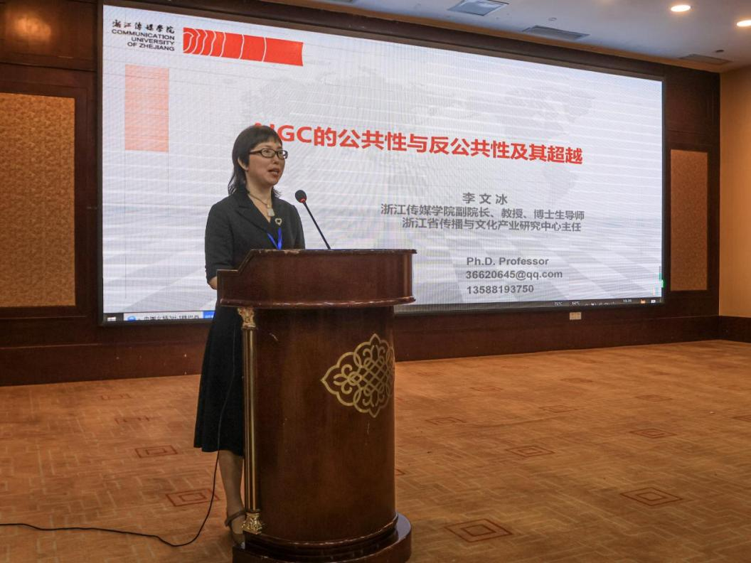上午10:30,主旨发言正式开始,由浙大城市学院新闻与传播学院院长沈爱国教授主持。会议上,浙江传媒学院副校长李文冰教授作主旨发言,题目是《AIGC 的公共性与反公共性及其超越》。