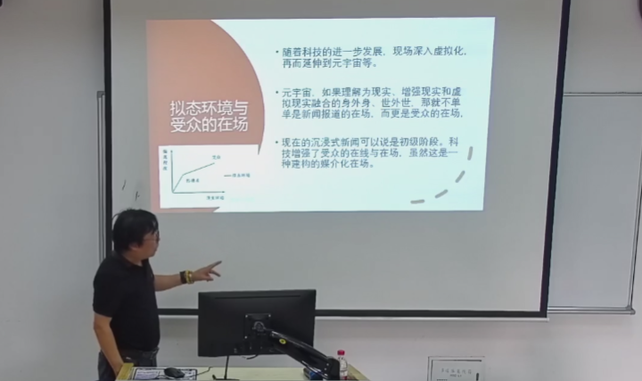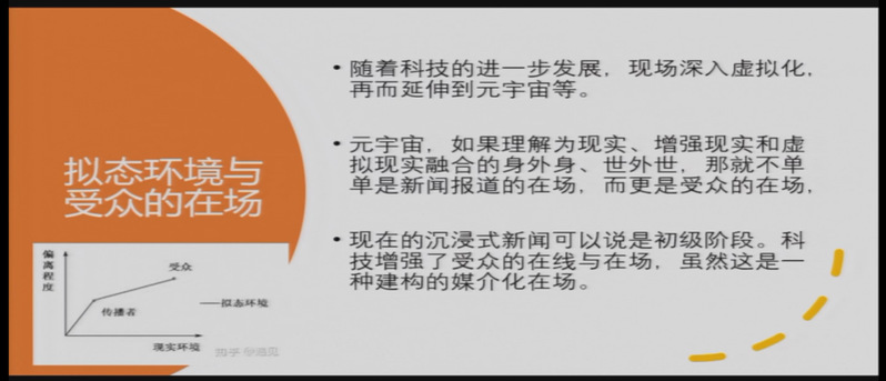 新闻的现场受时空限制,而随着传播科技的进步出现了现场直播,科技的进一步发展,现场深入虚拟化再而延伸到元宇宙等。在彭增军教授看来,元宇宙如果理解为现实、增强现实和虚拟现实融合的身外身、世外世,那就不单单是新闻报道的在场,而更是受众的在场,现在的沉浸式新闻可以说是初级阶段。科技增强了受众的在线与在场,虽然这是一种建构的媒介化在场。
