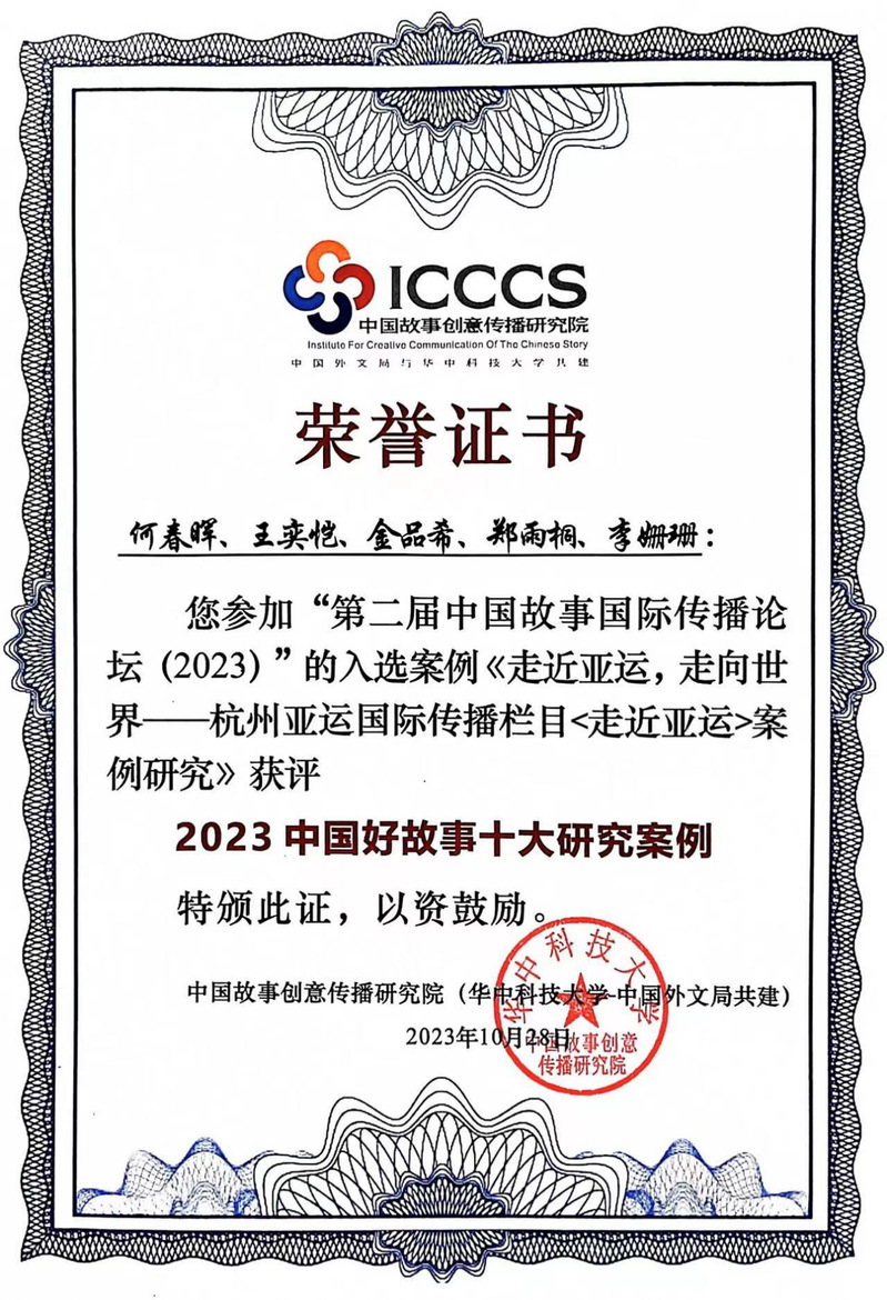 10月27日至28日, 第二届中国故事国际传播论坛(2023)在武汉华中科技大学顺利举行。本届论坛立足于党的二十大精神,以“十年回眸:讲好中国故事,提升国际传播能力”为主题,致力于发现一批中国故事国际传播高质量研究成果,挖掘一批中国故事国际传播的典型案例,探讨中国话语和中国叙事体系的构建之路。来自国内外各大高校、科研院所的专家、学者和学生共同参与了本次论坛,共同探讨中国故事及其背后的思想力量与精神力量。威廉希尔(WilliamHill-中文官方网站)提交的《走近亚运,走向世界——杭州亚运国际传播栏目<走近亚运>案例研究》获评本届“2023中国好故事十大研究案例”。