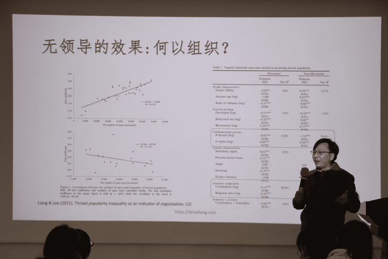 随后,梁海老师深入介绍了连接性行动中的无领导的结构,指出这种类型的行动通常缺乏专业的领导者,正式的组织架构以及专业的指导。值得注意的是,梁老师强调互联网中存在不平等分布的用户影响力,这使得领导者的涌现具有不稳定性。
