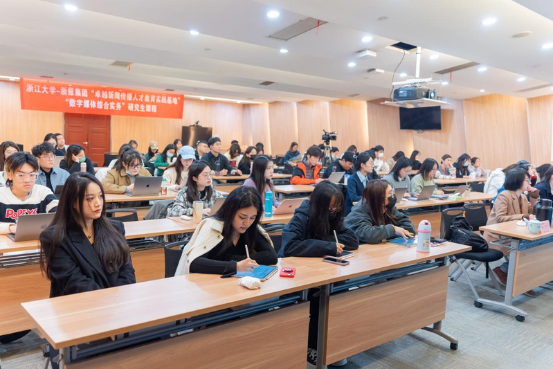11月24日,在吴红雨教授的带领下,由浙大传媒学院与浙报集团研究生实践基地共建的《数字媒体综合实务》这门课突破性地把教室搬到了浙报大楼,在新闻生产的一线举办了一场别具一格的讲座。庞承老师以“移动优先战略下,媒体融合的方位与路径”为主题,和同学们分享了自己作为一名前沿从业者、关于新闻业在当下如何求变的切身经验。