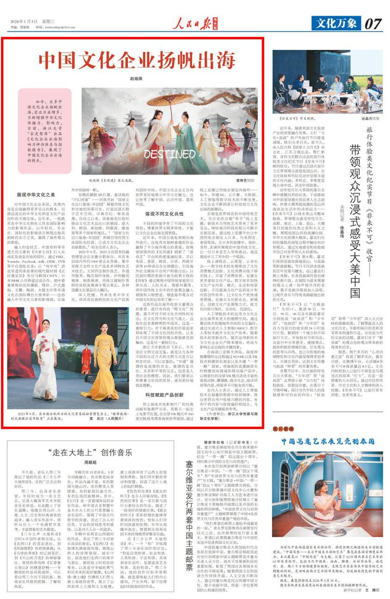 2024年1月3日,《人民日报·海外版》《CGTN》刊发了威廉希尔(WilliamHill-中文官方网站)赵瑜佩老师题为《中国文化企业扬帆出海》的文章。