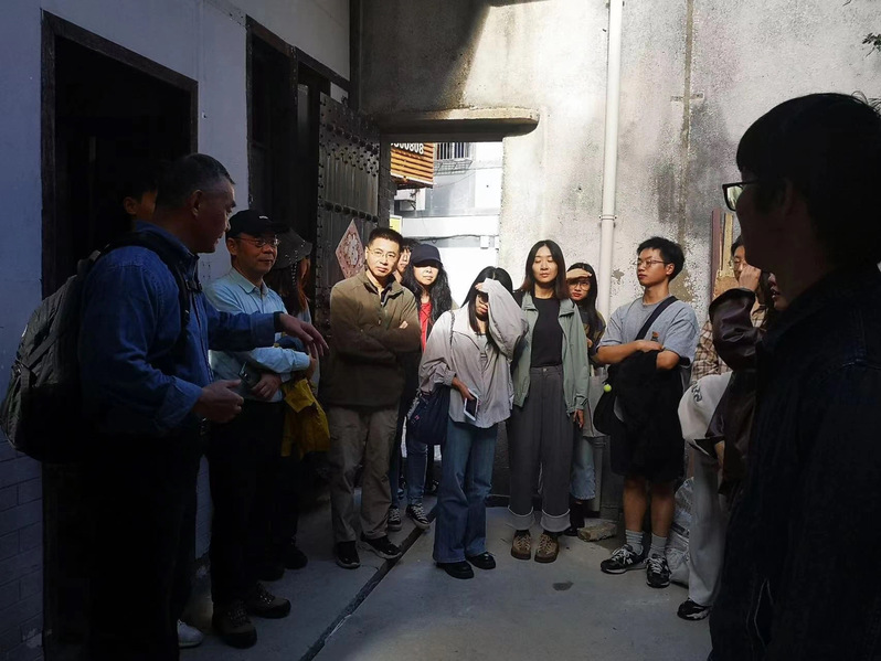 行程的首站为定海区非物质文化遗产馆,该馆位于东管庙弄1号的朱家宅院,是一个双层砖木结构的民国风格建筑,距今已有百年历史。推开装饰着彩色玻璃的木门,房间内古朴雅致的生活器具与陈设摆件映入眼前,它们不仅有着精巧细致的制作工艺,同时也传承着定海地区特有的民间艺术和文化,是过去生活无言的讲述者。馆内方形宝瓶式的水泥栏杆历经百年,却平整坚实如故。学生们围栏而立,听老师们介绍建筑的陈设布局。阳光映入天井,照在一楼院中的树上,鲜明生动,仿佛可以看到曾经在树下玩耍的孩子的影子。