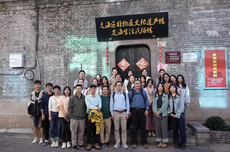 29日上午,师生一行前往舟山市定海区新建村。沿途经行一大段山路,道路蜿蜒曲折却平坦宽阔。在一处地势稍平的地方,眼前景色突然开阔,层峦叠嶂之间,几处整洁古朴的白色建筑群落散布其间,这便是此行的目的地新建村所在。