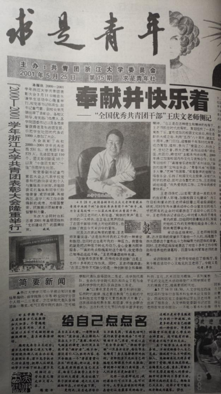 王庆文认为,理想主义永远给人以正向的激励,“激情”和“理想”恰贯穿其工作始终。即便是毕业后的第一份共青团工作,一干,那就是一整个青春。以“为青年成长成才提供帮助”为己任,彼时的他,常借吃饭的机会和学生干部谈心,也通过不断的赞赏给予更多学生参与共青团工作的勇气,就算是批评,也多以插科打诨的玩笑话委婉表达。2001年,王庆文书记荣获全国优秀共青团干部,切实做到了“让理想主义的旗帜在共青团的上空高高飘扬”。除了外界的嘉奖,王庆文也欣喜地看到自己的学生在各个领域发光发热,桃李满天下不禁让他的工作激情和成就感又多了几分。用他的话讲,那就是“奉献并快乐”。