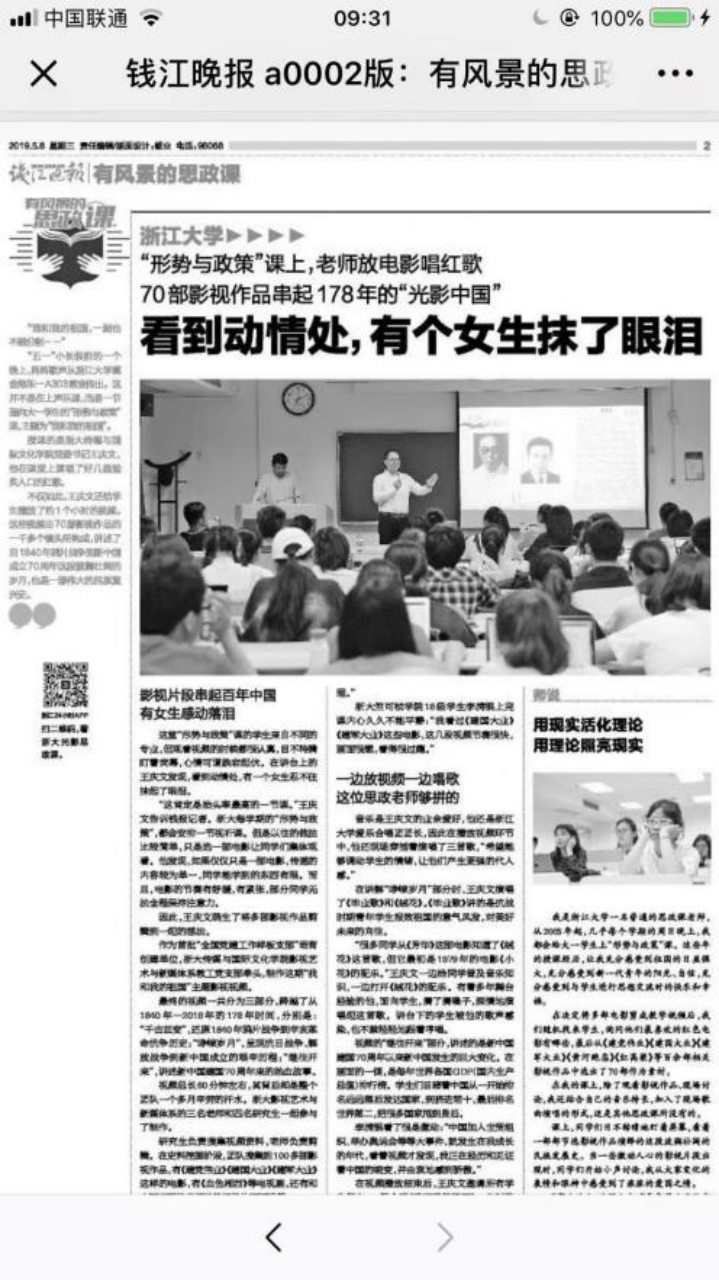 王庆文书记主讲的形势与政策课堂登上钱江晚报