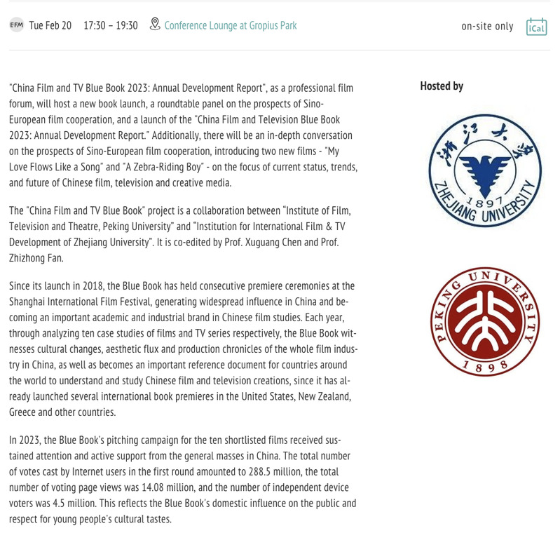 2024年2月20日,在第74届柏林国际电影节上,由北大与浙大联合举办的“中国影视蓝皮书2023:年度发展报告”行业论坛,将进行中国2023年度“十大影响力电影、电视剧”国际发布。