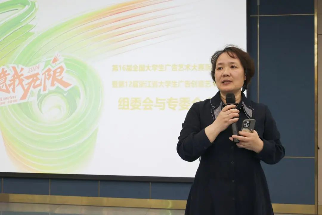组委会会议伊始,章燕老师上台致欢迎词,对与会的专家学者和教师代表们表达诚挚感谢。随后,章燕老师以“三则消息”统领本次会议发言。第一,她回顾了2023年浙江赛区的突出成绩——在各个广告类别竞赛中,浙江赛区一等奖数目在全国29个省赛区中位列第一,等级奖加权总和为全国第一,创造了蝉联三年全国第一的佳绩。第二,她指出国家政策不论在人才培养还是市场支持上,都进一步扶持广告行业的发展,这对学科发展和赛事举办都注入了一针强心剂,表达了希望广告行业越走越好的愿景。第三,她认为广告学科和行业的进步需要结合现今快速发展的人工智能和社交媒体,展开AI营销传播、社交媒体营销等方面的研究,从而为竞赛和学科进步提供了新的维度。最后,章燕老师对赛事开展的相关细节问题进行了进一步说明,并预祝本次大广赛顺利举行。
