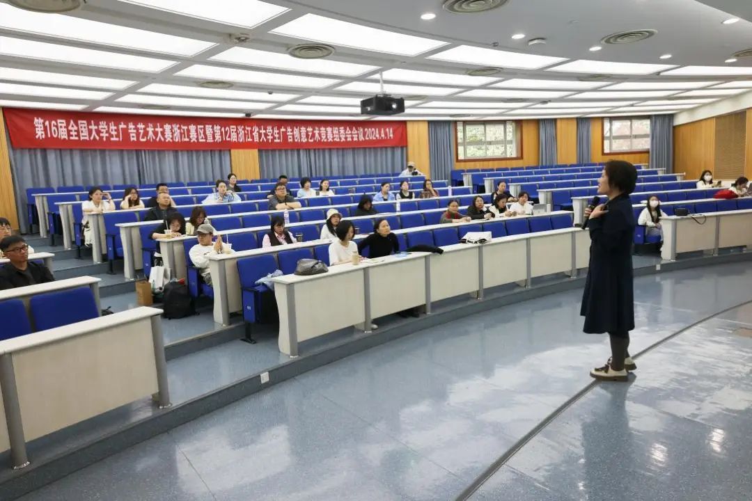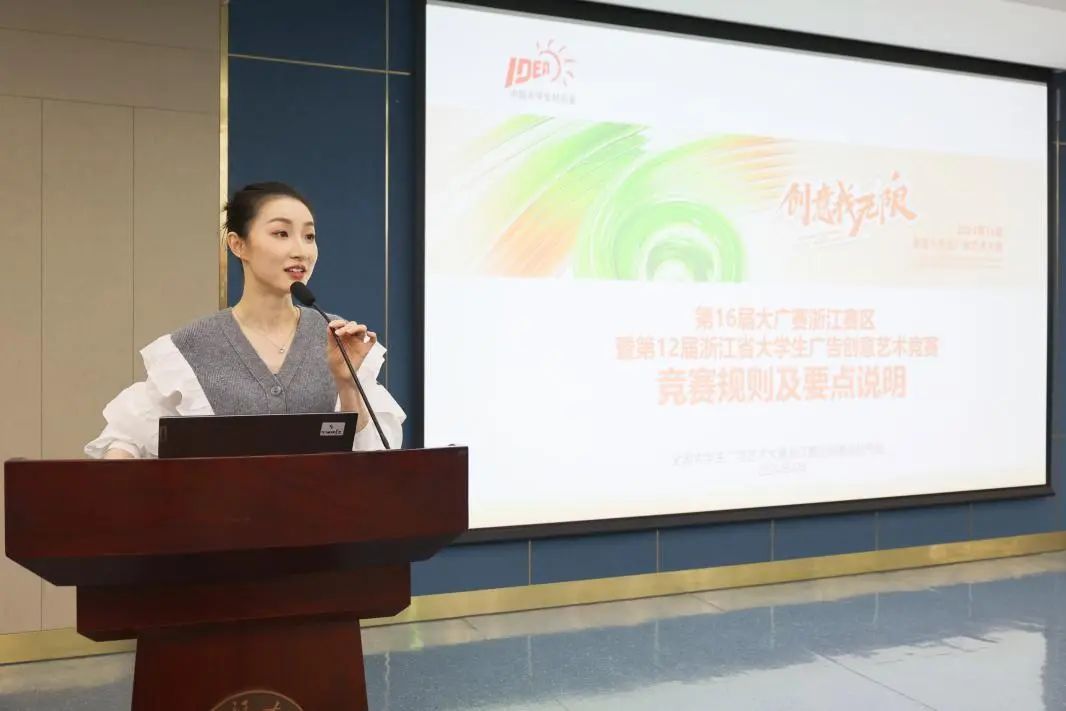 随后,大广赛浙江赛区组委会许今茜老师代表组委会对本届大赛的竞赛类别、参赛流程、创作原则等方面进行了详细介绍。在竞赛类别上,本次在主赛道上新增了科技类(生成式AI设计方向)赛道,而在省级专项赛道上建构了“金桂杯”专项命题。在大赛流程上,详细指明了本次大赛的时间节点,并对学生参赛流程及高校管理员的审核报送流程进行了周详的梳理。在创作原则上,组委会强调广告创作要有原则、讲导向、重创新、明审题,杜绝故意抄袭、过度模仿等原创性问题。另外,组委会对本届大赛在更新改动方面做了详细告知,并指出了往年申报流程中的易错操作,充分展现了组委会在大赛的历年举办实践中精益求精的严谨精神。