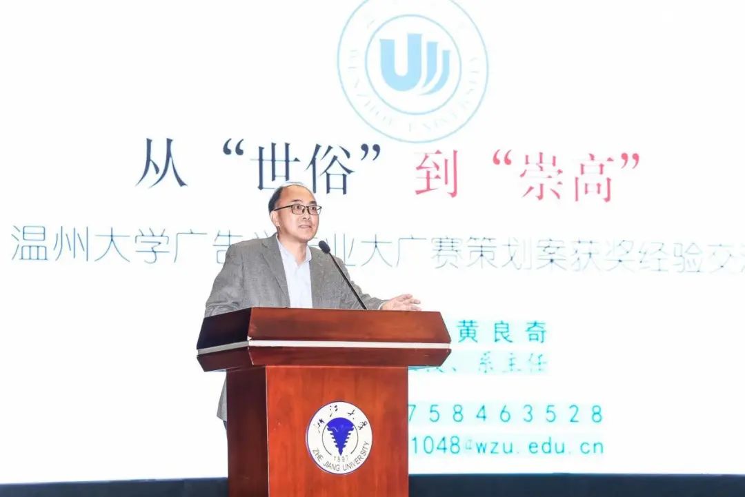 为了能够促进深度交流,让更多的院校师生在大广赛中获益学习,活动邀请了本届比赛中取得突出成绩的优秀指导教师作经验分享。来自温州大学人文学院广告学系主任——黄良奇老师,为大家做了策划类的经验分享交流。黄老师详细介绍了温州大学在策划案方面的获奖情况,并强调了策划案这一形式对学生综合素质提升的重要作用。以“从世俗到崇高”为题,从学校高度重视、系室全力执行、学生积极行动、以策划案为例的分析四个方面与大家分享了获奖经验。他围绕“就是这么合拍”策划案,介绍了参赛选题对获奖结果的重要性,并阐释了如何从产品本身出发进行美学、哲学等方面的思考并进一步升华主题。