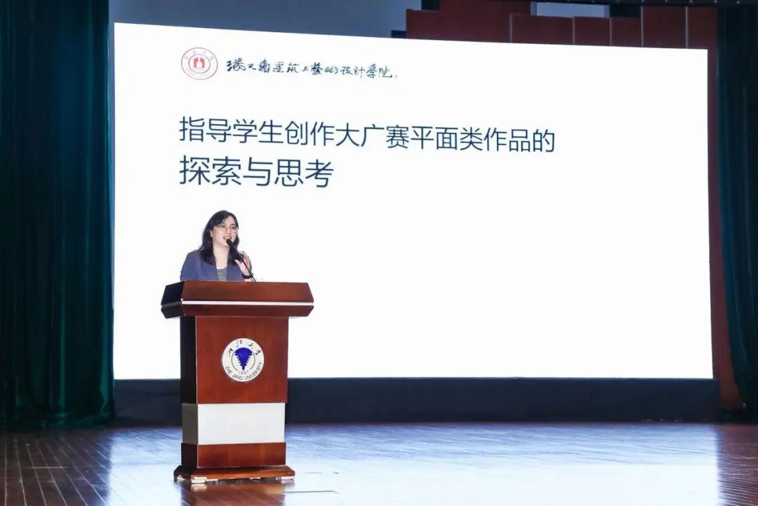接下来是宁波大学潘天寿建筑与艺术设计学院副教授周艳老师,同大家分享平面类参赛作品的获奖心得。周老师以获得一等奖的 “感”爱系列作品等为例,从画面对主题的阐释、设计细节优化、方案文案调整和作品细节关注等方面阐释了平面类作品的获奖心得;并最终从教学相长、“偶然”与“必然”以及人工智能三个方面分享了自己的思考。
