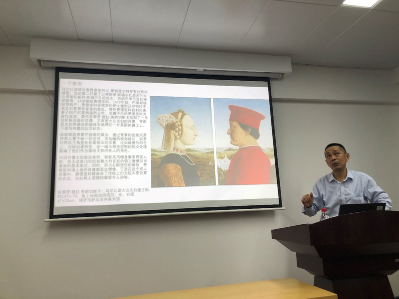 接着,吴琼教授从阿尔伯蒂的“人妻须知”这一角度切入,深入剖析了女性美是如何被“发明”出来的。他强调,女性形象并非自然而然的存在,而是经过能指化的表征所构建的。其中,皮耶罗的《乌尔比诺大公夫妇正面像》成为了一个引人注目的案例。这幅作品在风格上明显受到了北方艺术的影响,展现出一种沉静而庄重的特质。在构图上,背景的设计尤为独特,大公夫妇背后的风景完全相同,仿佛他们站在同一高度,眺望着远方的世界。这种构图方式不仅增强了画面的稳定性,更通过背后的风景将他们的头和身体巧妙地分离开来。