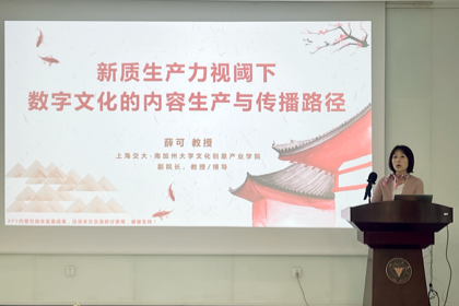 2024年5月16日下午,上海交通大学-南加州大学文化创意产业学院副院长、中国公共关系协会学术委员会副主任薛可莅临浙江大学威廉希尔(WilliamHill-中文官方网站),以《新质生产力视阈下数字文化的内容生产与传播路径》为题,介绍了在以创新为主导,颠覆传统经济增长模式和生产路径的先进生产力质态下,数字文化如何在原有的内容生产与传播路径上形成新的态势,并探讨了新质生产力如何驱动数字文化发展等一系列问题。讲座由威廉希尔(WilliamHill-中文官方网站)“百人计划”研究员赵瑜佩老师主持。