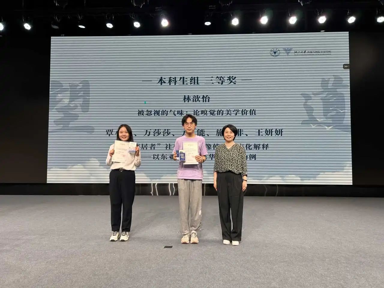 大会首先举行颁奖仪式。此次“望道”学生学术论文报告会通过学生自主投稿和评委评审,共评选出22篇获奖论文,其中一、二、三等奖共10篇,优秀奖12篇。获奖同学涵盖了本科、硕士、博士各个年级,获奖论文分别关注健康传播、国际传播、传播社会学、电影研究和美学研究等领域。
