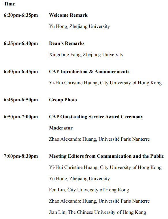 Both events are sponsored by the College of Media and International Culture at Zhejiang University and will provide a unique opportunity for exchanging ideas and for networking with fellow scholars, engaging in lively conversations, and, last but not the least, celebrating the achievements of Communication and the Public.