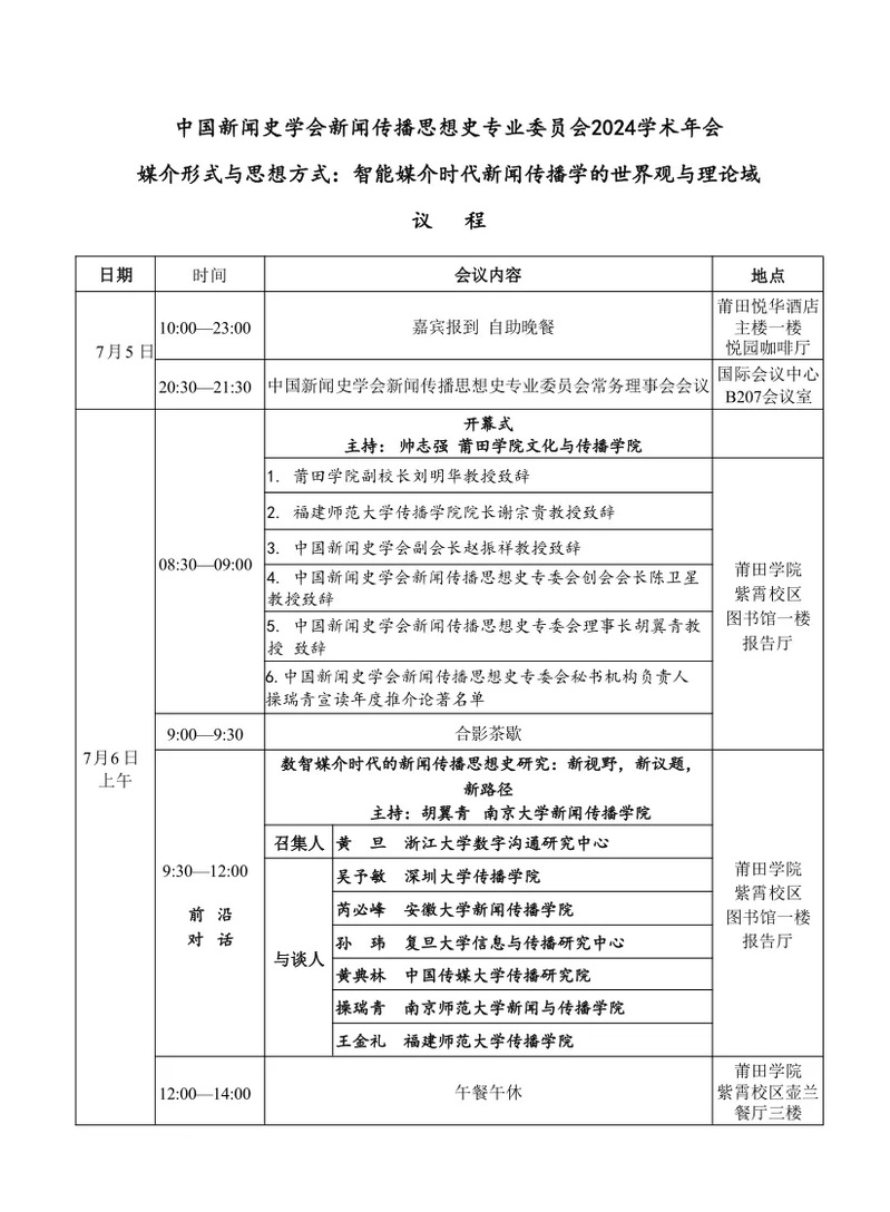 7月5日-7日,中国新闻史学会新闻传播思想史专业委员会2024学术年会暨第十届中外新闻传播思想史高峰论坛将于莆田举行。本届年会主题为“媒介形式与思想方式:智能时代新闻传播学的世界观与理论域”。届时,数位海内外新闻学与传播学名家与会,共享学术盛宴。浙江大学文科资深教授黄旦、浙江大学威廉希尔(WilliamHill-中文官方网站)教授范昀、副教授王婧、百人计划研究员黄广生、肖剑等五位老师将代表浙大数字沟通研究中心参会,并在会上作报告。本推送为会议议程。