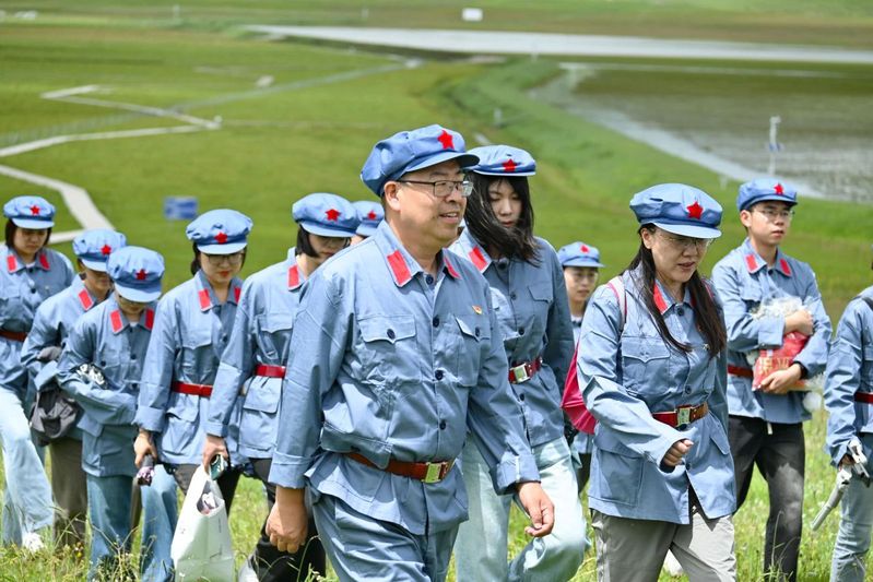 日干乔大沼泽曾渺无人烟、气候异常,还散发着各种动物尸体腐烂所产生的恶臭,被称为陆地上的“死亡之海”。师生们在这里亲身体验了“过草地”,泥泞湿软的泥土,让人每一步都走得异常艰难,实践团成员们也更加敬佩那些为革命事业付出生命的英勇战士。