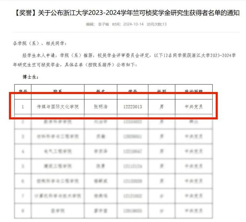 此次荣获竺可桢奖学金,是对张明浩学术成果和综合素质的充分肯定,也是对他未来学术道路的美好期许。希望今后,张明浩继续保持对学术的热爱和追求,同时,也期待更多的学子能够像张明浩一样,在学术研究和实践中不断追求卓越,为社会的进步和发展贡献自己的力量