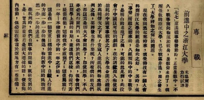 八十多年前,当抗日战火即将蔓延到浙大校园,正在学习、科研的师生该何去何从?个体的生死,大学的存亡,国家的命运,都在一线之间。当时的浙大亲历者,如何抉择?如何行动?如何走上了西迁的漫漫长路?在1939年1月的 Asia(亚细亚)杂志上,浙大外教 Franz Michael(梅谷)撰写了文章 A University on the March(一所前进中的大学)。他用纪实的文字,向世界展现了浙大师生在西迁办学途中不畏艰险、勤奋好学、心系家国的精神风貌。这篇文章的中文版《前进中之浙江大学》还曾转载刊登在《国立浙江大学校刊》(1939年3月13日)中。