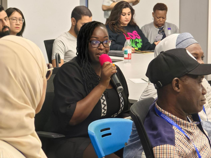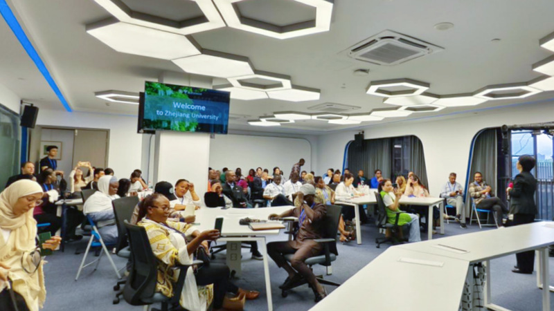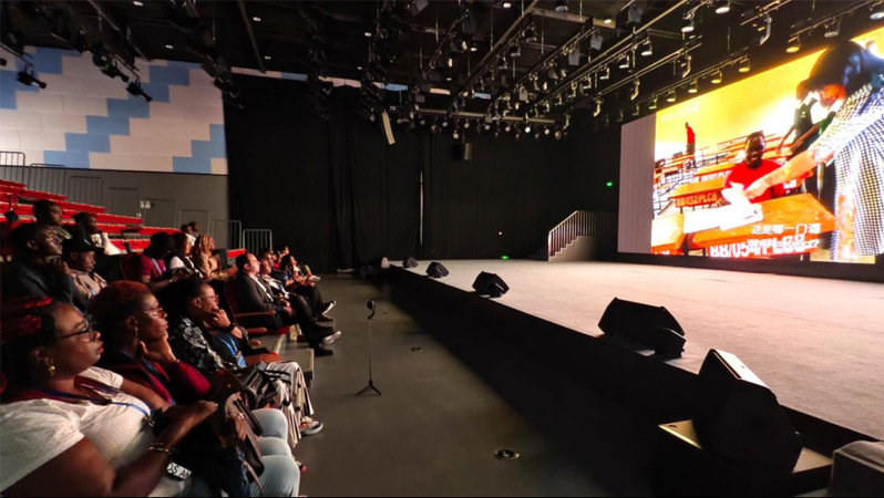 师生作品观影环节,国际媒体人们来到融媒体演播厅,观看了《经纬之间》《90后的中非情缘》《我到非洲去》《水让我重生》等师生创作的精彩片段。当画面中出现非洲大陆的壮丽景观、中非建设者携手工作等场景时,现场响起阵阵欢呼与掌声,不少媒体人在熟悉的家乡画面前举起手机记录,并与身边同行热情交流。
