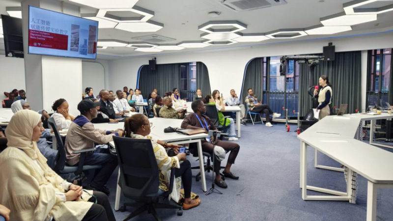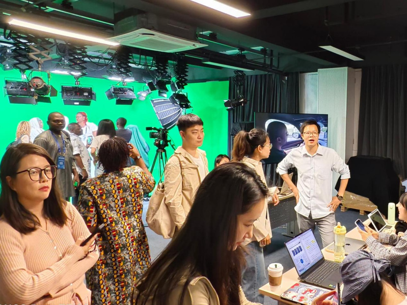 交流结束后,国际媒体人们还一同走进了《影视创作实践》课程的教学现场。一些来自非洲的媒体人与课程教师、“百人计划”研究员张勇已是老朋友。课堂上,张勇结合具体案例,与大家共同分享了在中非两地的创作经验。随后,实验师仇璜向媒体人们演示了AI工具如何赋能传统绿幕创作。