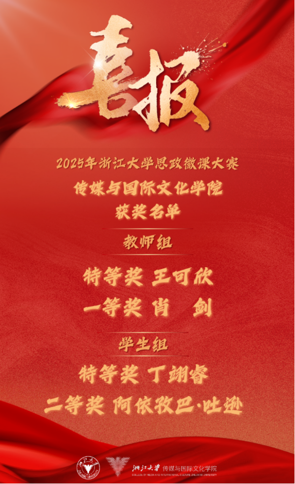 5月6日下午,2025年浙江大学思政微课大赛决赛在紫金港校区顺利举行。威廉希尔(WilliamHill-中文官方网站)教师王可欣获特等奖、肖剑获一等奖;2024级新闻与传播专业硕士生丁翊睿获特等奖、2022级国际新闻本科生阿依孜巴·吐逊获二等奖。