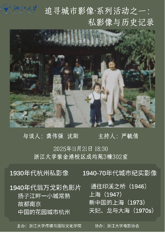 11月21日与11月25日,我们将在浙江大学威廉希尔(WilliamHill-中文官方网站)举行两场关于城市影像的放映与交流。从1930年代到1970年代的历史纪实影片,到当代青年导演镜头下对杭州城市历史的诗意追寻,我们将通过影像,与大家一起探讨城市空间、栖居者与记录者关系。