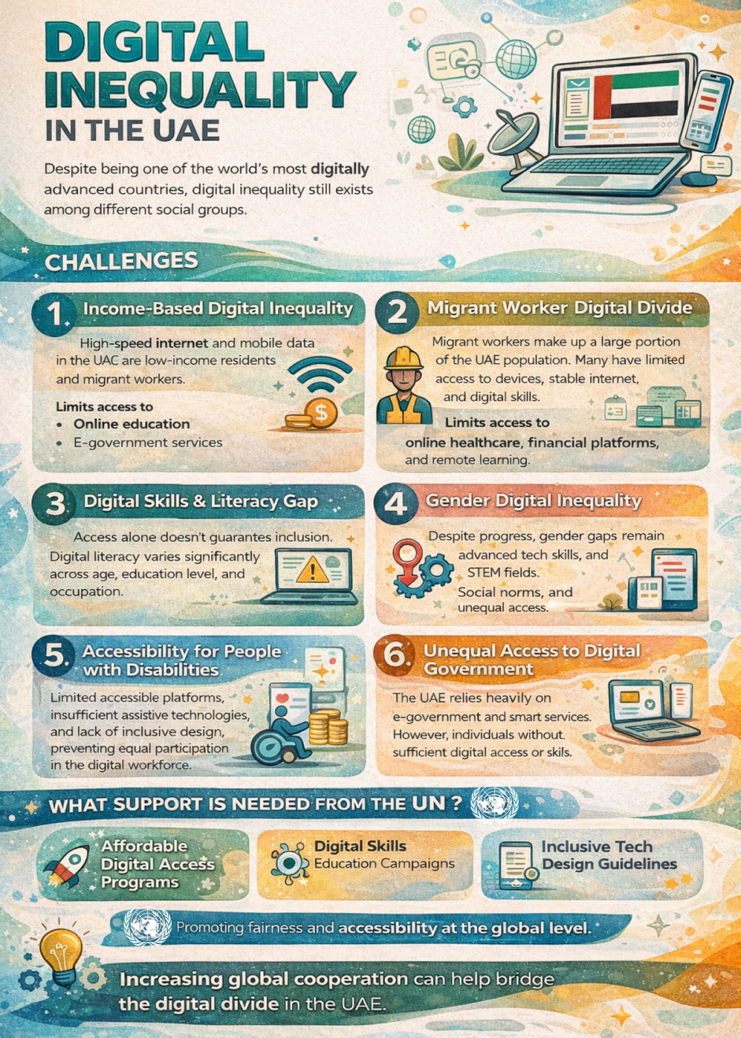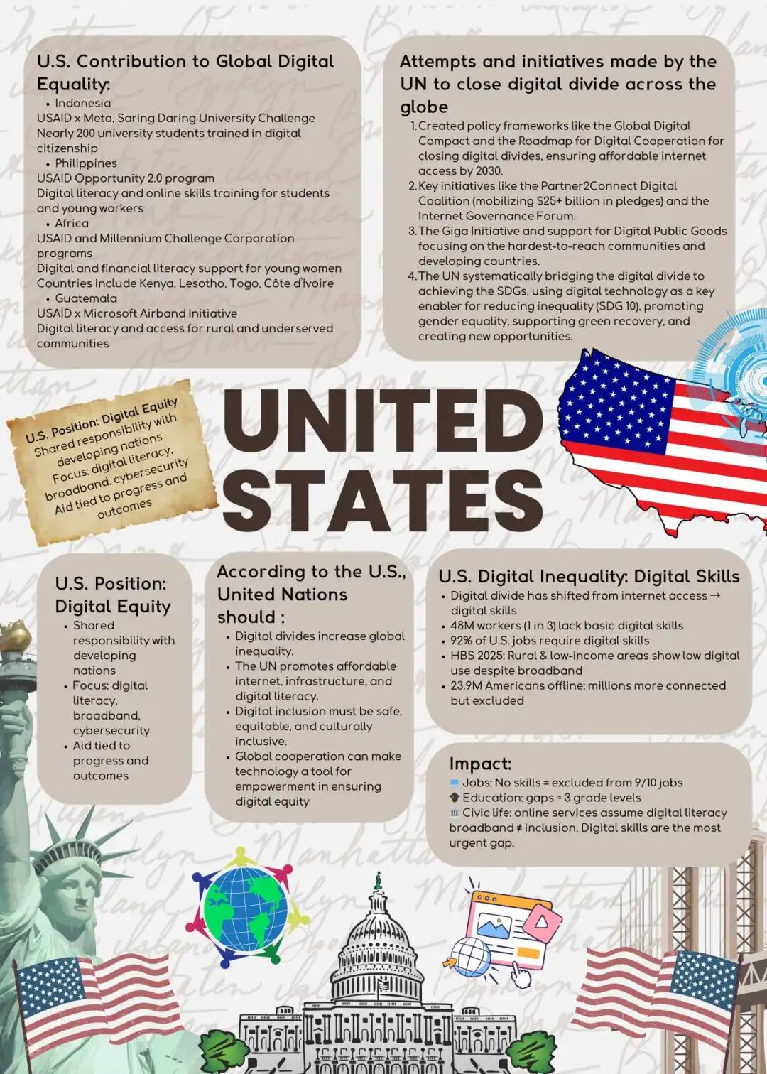 各代表团认为,联合国应在推动全球数字平等中发挥关键作用,包括提供基础设施技术支持、制定包容性数字治理框架、开展能力建设与跨境知识共享,并呼吁发达国家承担相应技术扶持与资源共享责任。