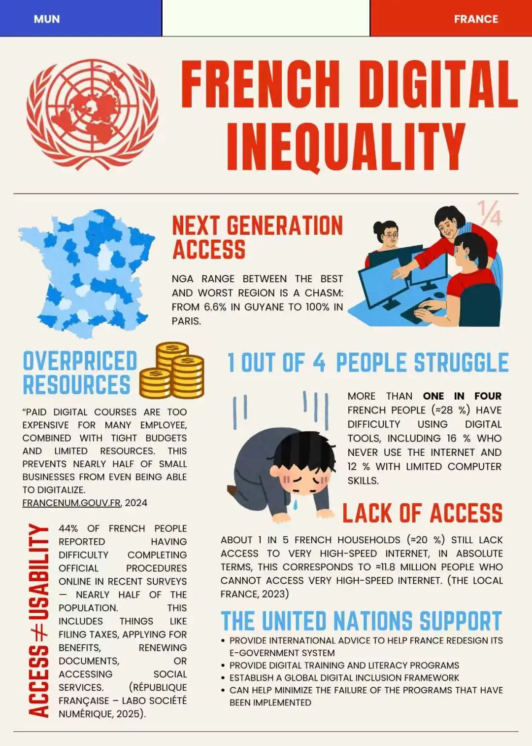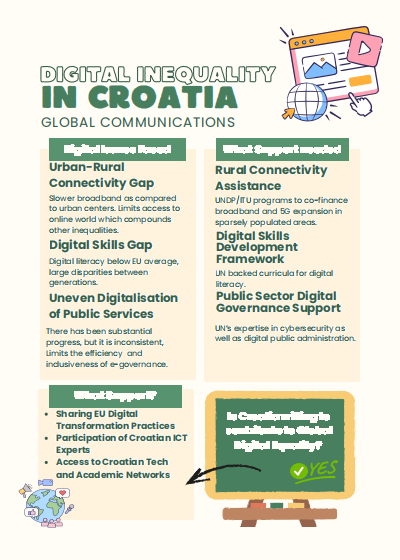 针对数字基础设施建设议题,泰国与印度尼西亚代表聚焦于群岛地理环境带来的特殊困难,将“网络质量不均且不稳定”列为最紧迫的挑战;孟加拉国代表则指出国内存在数字政策执行薄弱、农村基建投入不足等问题,亟需在扩大农村宽带覆盖、资助数字扫盲计划、推广可负担的智能设备与低成本数据服务等方面获得支持;针对家庭、学校与原住民数字接入议题,印度代表以数据指出农村地区超过半数的家庭缺乏有效数字接入,倡导通过社区主导的培训与国际合作弥补鸿沟;新西兰代表则强调应在数字进程中融入本土文化保护与原住民权利保障;针对发达国家的数字素养鸿沟议题,美国代表指出数字鸿沟已从“接入问题”转向“技能问题”,美国国内有一定劳动力缺乏基础数字能力;法国代表指出法国国内城乡与区域间的数字素养存在巨大断层,近半数小型企业因资源有限难以实现数字化转型;克罗地亚代表强调城乡宽带覆盖与数字技能的双重差距;阿联酋代表则反思即便在数字化领先国家,收入、移民身份、性别与残障等因素仍可能导致数字排斥。