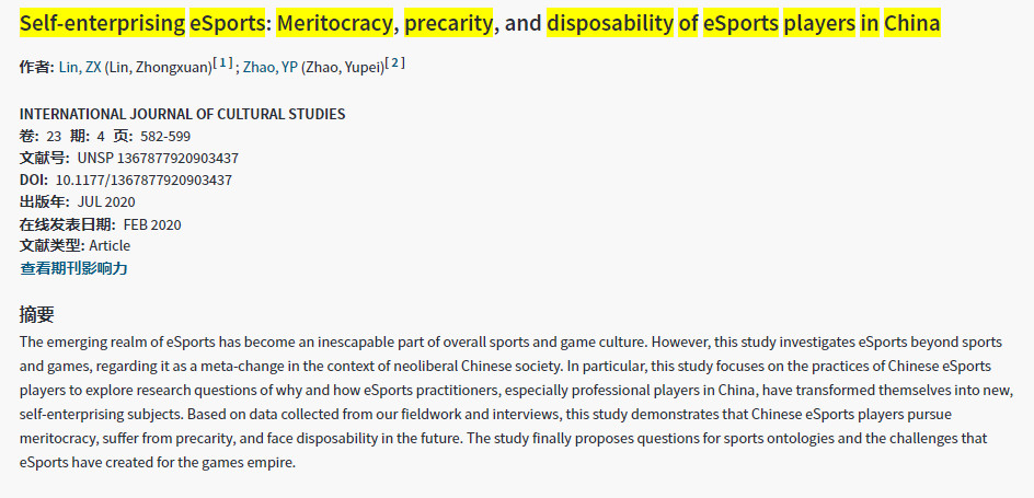 2020-09-02 《INTERNATIONAL JOURNAL OF CULTURAL STUDIES 》林仲轩,赵瑜珮The emerging realm of eSports has become an inescapable part of overall sports and game culture. However, this study investigates eSports beyond sports and games, regarding it as a meta-change in the context of neoliberal Chinese society. In particular, this study focuses on the practices of Chinese eSports players to explore research questions of why and how eSports practitioners, especially professional players in China, have transformed themselves into new, self-enterprising subjects. Based o 更多 -