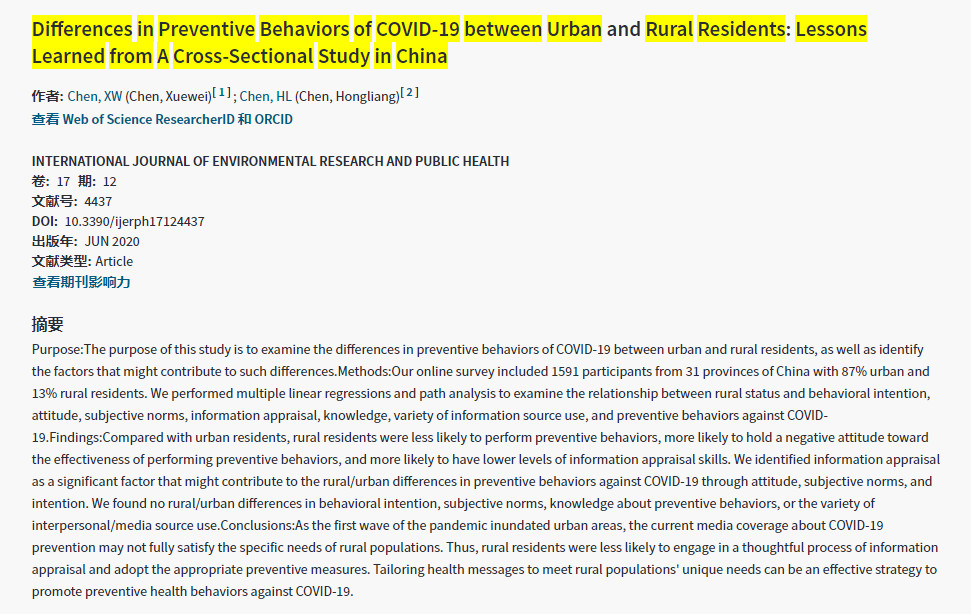 2020-09-02 《INTERNATIONAL JOURNAL OF ENVIRONMENTAL RESEARCH AND PUBLIC HEALTH》Chen, Xuewei,陈宏亮Purpose:The purpose of this study is to examine the differences in preventive behaviors of COVID-19 between urban and rural residents, as well as identify the factors that might contribute to such differences.Methods:Our online survey included 1591 participants from 31 provinces of China with 87% urban and 13% rural residents. We performed multiple linear regressions and path analysis to examine the relationship between rural status and behavioral intention, attitude, subjective norms, informati 更多