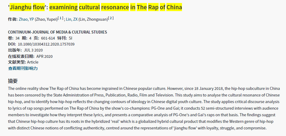 2020-09-02 《CONTINUUM-JOURNAL OF MEDIA & CULTURAL STUDIES 》赵瑜珮、林仲轩The online reality show The Rap of China has become ingrained in Chinese popular culture. However, since 18 January 2018, the hip-hop subculture in China has been censored by the State Administration of Press, Publication, Radio, Film and Television. This study aims to analyse the cultural resonance of Chinese hip-hop, and to identify how hip-hop reflects the changing contours of ideology in Chinese digital youth culture. The study applies critical discourse analysis to lyrics of rap songs perfo 更多 -