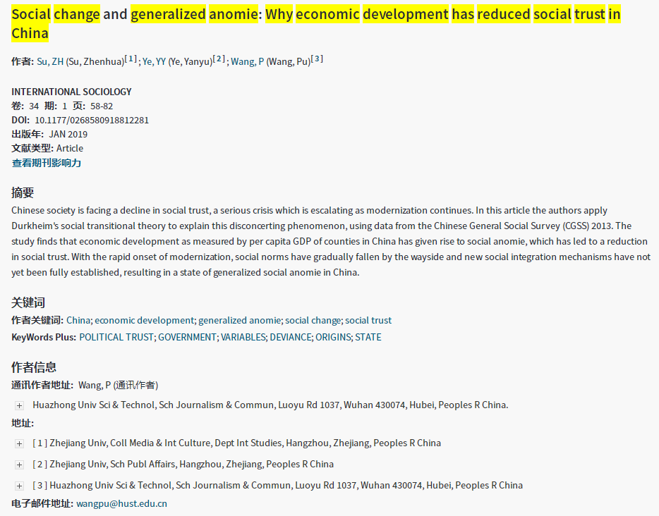• Chinese society is facing a decline in social trust, a serious crisis which is escalating as modernization continues. In this article the authors apply Durkheim’s social transitional theory to explain this disconcerting phenomenon, using data from the Chinese General Social Survey (CGSS) 2013. The study finds that economic development as measured by per capita GDP of counties in China has given rise to social anomie, which has led to a reduction in social trust. With the rapid onset of moderniz... 更多