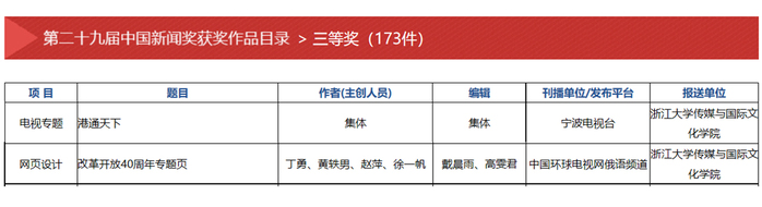 The 29th China Journalism Award, sponsored by All-China Journalists Association, presented two third-prize winners recommended by College of Media and International Culture at Zhejiang University. The two works are Thematic Web Page onthe 40th Anniversary of Reform and Opening up by the Russian Channel of China Global Television Network, and From Ningbo to the Globe by Ningbo Television Station.
