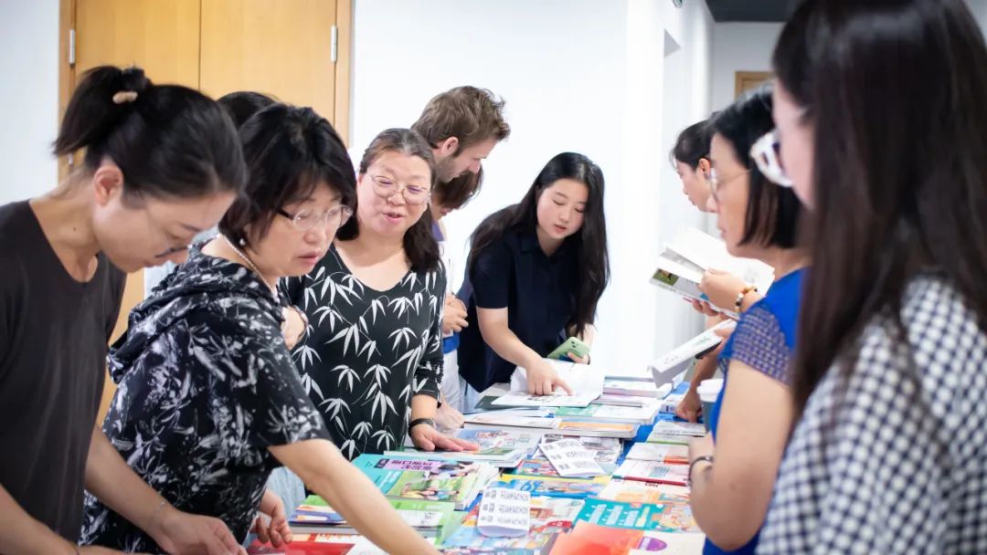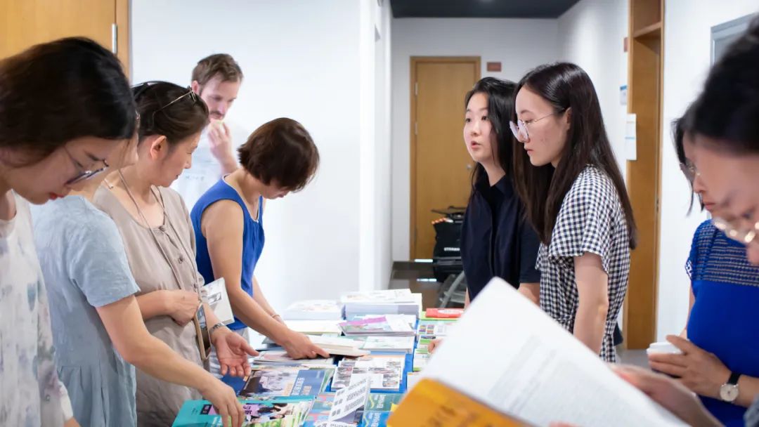 In the morning, the delegation was led by Ju Hui, the head of Chinese Language and Culture Publishing Branch at Foreign Language Teaching and Research Press, in a book exhibition held at the School of Media and International Culture. The exhibition featured a wide range of materials, from basic to advanced Chinese textbooks, practical spoken Chinese to Chinese culture, including books on Chinese culture tailored for the French audience. The editors from the publishing house personally introduced the highlights and specialties of the exhibition to the European Chinese teacher delegation.