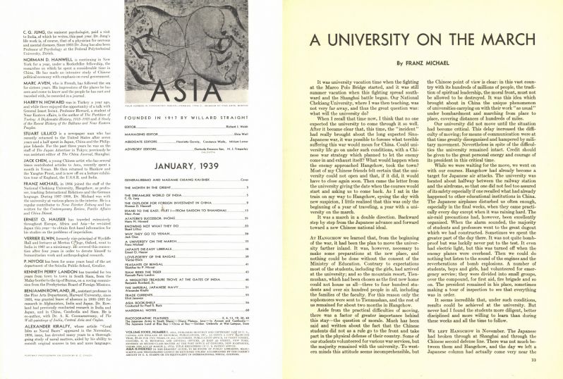 In January 1939, the Asia magazine published an article titled A University on the March, written by Zhejiang University's foreign teacher Franz Michael. Through this piece, Michael depicted the spirit of Zhejiang University's faculty and students as they bravely faced adversity, worked diligently, and remained devoted to their homeland while relocating westward to continue their education and research. This article was later translated into Chinese and was reprinted in the National Zhejiang University Bulletin on March 13, 1939.